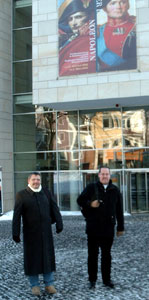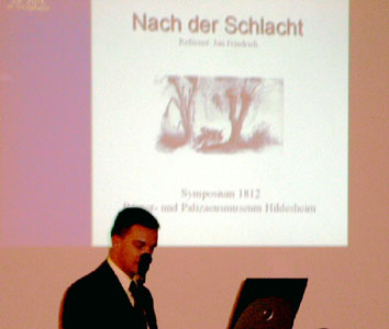 Am 01.02.2003 trafen sich die Clubmitglieder Martin Huschka, Gerd Wägner, Holger Barthen und ich (Norbert Weise) in Hildesheim, um das Symposium "Russlandfeldzug 1812" sowie die Ausstellung "Napoleon Bonaparte - Zar Alexander Epoche zweier Kaiser" zu besuchen. Der weite Weg hat sich gelohnt. Vielen Dank an alle, die das Symposium vorbereitet und als Referenten durchgeführt haben, wie Marcus Stein, Jan Friedrich, Marcus Gärtner, Peter Schuchardt, Oliver Schmidt, Alfred Umhey, Dr. Thomas Hemmann und Helmut Börner. Die Tagesordnung kann bei NAPOLEON ONLINE nachgelesen werden. Es war eine gelungene Veranstaltung, wie auch die Zahl der Besucher zeigte. Wer nicht dabei war, hat etwas verpasst. Es waren alles sehr informative und professionell vorbereitete Beiträge. Man konnte sogar Waffen der damaligen Zeit in die Hand nehmen, die Herr Börner mitgebracht hatte. War das ein Gefühl, den Säbel eines Grenadiers der Alten Garde in der Hand zu halten ... Nachfolgend einige Bilder, die einen Eindruck vermitteln sollen. Im Museum war das Fotografieren leider verboten. Ich wollte so gern ein Foto mit der Napoleon-Büste (ganz im Hintergrund) |